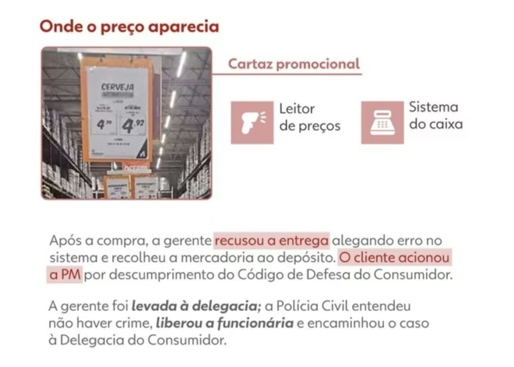 A Polícia Militar foi acionada e, conforme o registro policial, os agentes informaram à gerência sobre o artigo 35 do Código de Defesa do Consumidor, que garante ao cliente o direito de exigir o cumprimento da oferta, além do artigo 67, que tipifica o crime de propaganda enganosa.